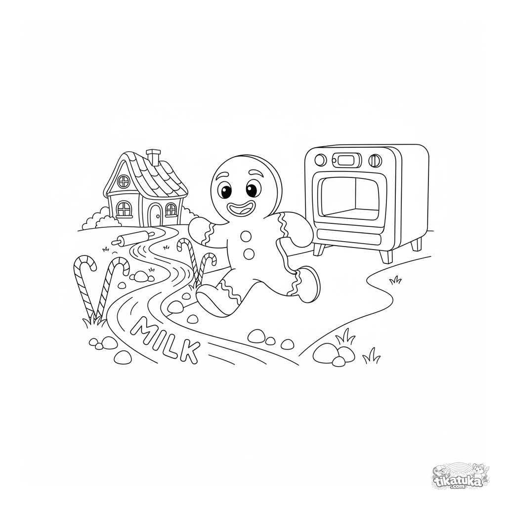 Página para colorir de conto: O Biscoito de Gengibre corre perto de um rio de leite em uma paisagem de doces. Cena vibrante do conto clássico para 4-6 anos.