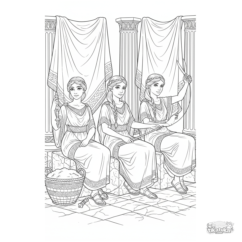 Página complexa para colorir para crianças 10-12: as três Moiras fiando o fio do destino no covil da Górgona. Estilo de gravura vintage.