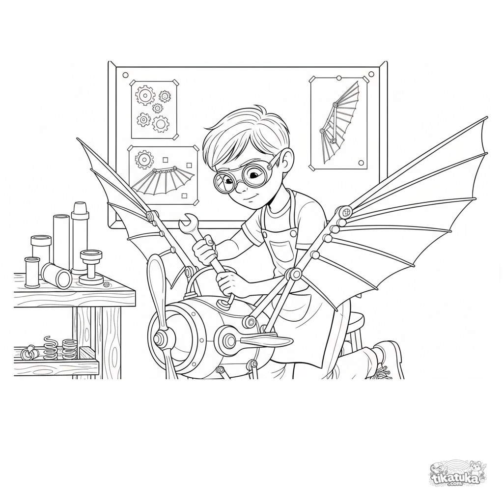 Página para colorir para pré-adolescentes de 7-9 anos: um jovem fazedor em um laboratório secreto conserta partes de sua engenhoca voadora steampunk.