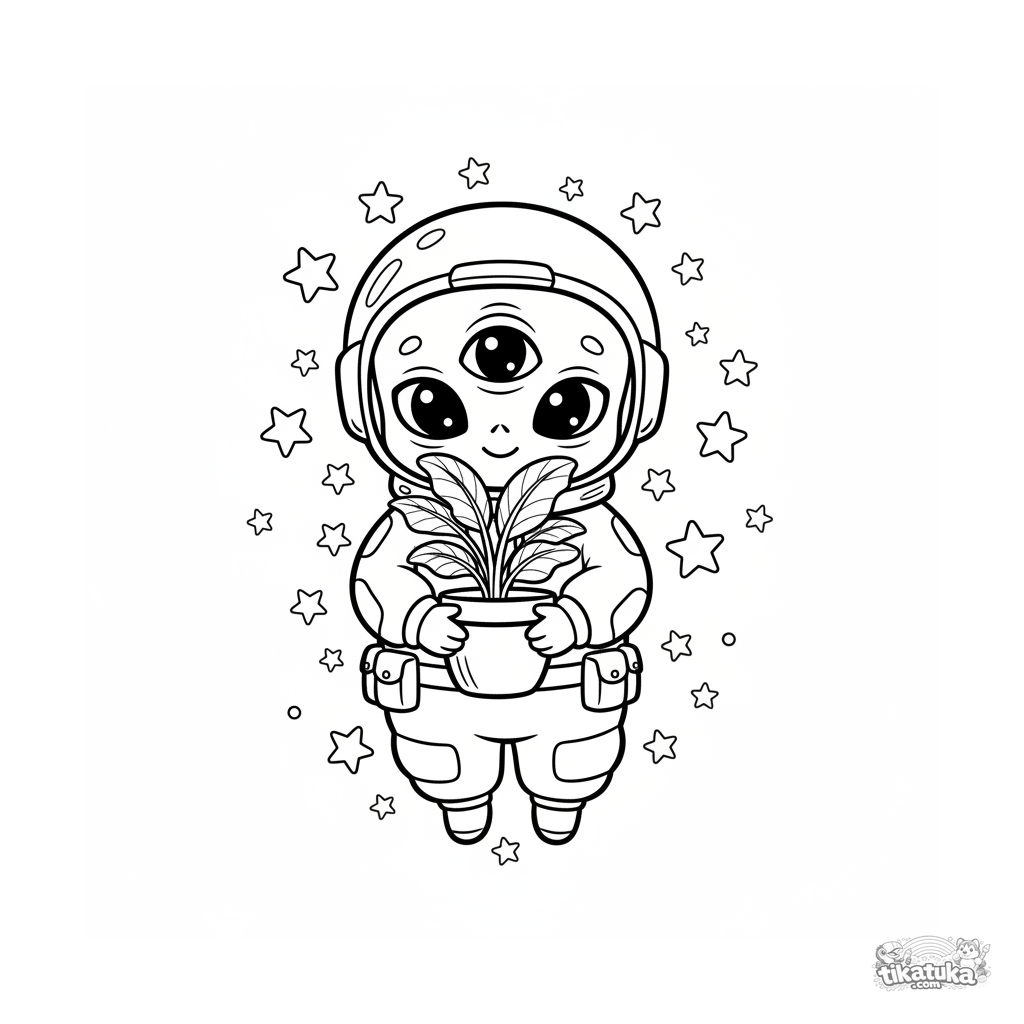 Página para colorir para crianças de 4-6 anos: um botânico alienígena fofo flutua entre estrelas segurando uma planta em vaso brilhante.