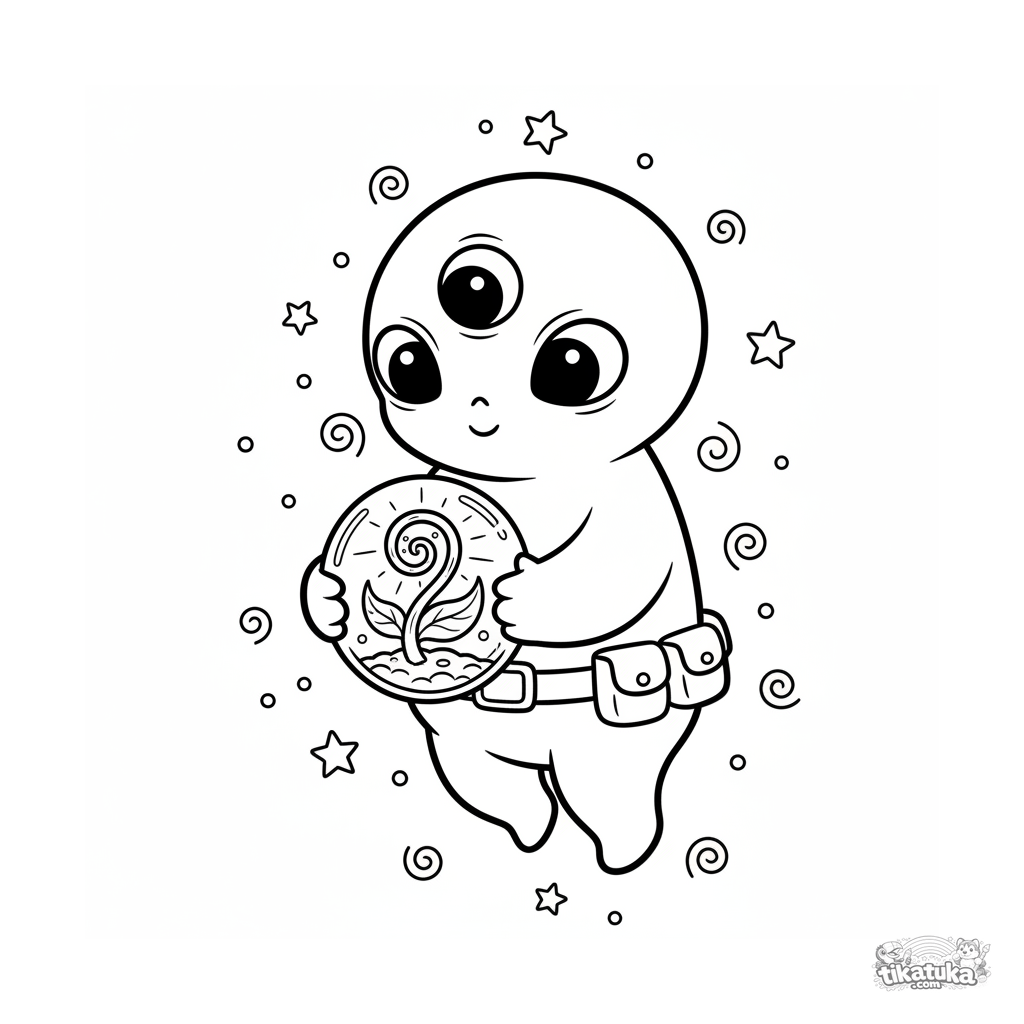 Página para colorir para crianças 4-6: um pequeno botânico alienígena flutua entre estrelas, segurando uma cápsula com uma planta brilhante única.