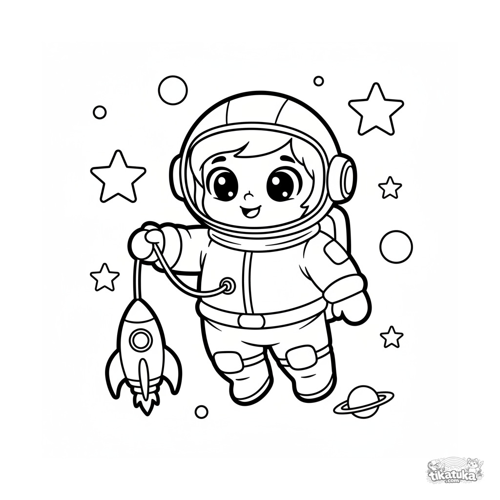 Página para colorir para bebês: um pequeno astronauta flutua entre estrelas no espaço sideral, segurando um foguete de brinquedo. Formas simples e margens amplas.