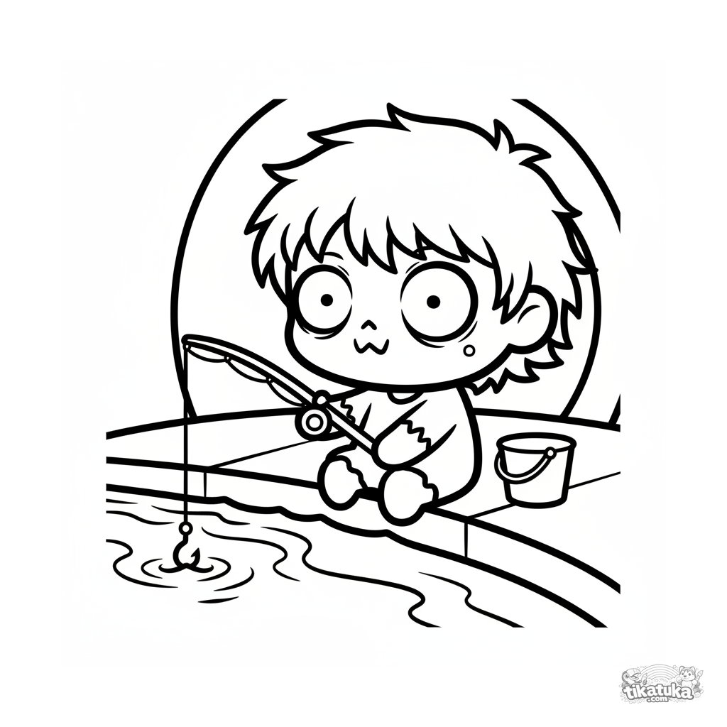 Página simples para colorir para bebês de 2-3 anos: um zumbi chibi fofo senta-se com uma vara de pescar perto de um riacho no esgoto. Formas grandes, poucos detalhes.