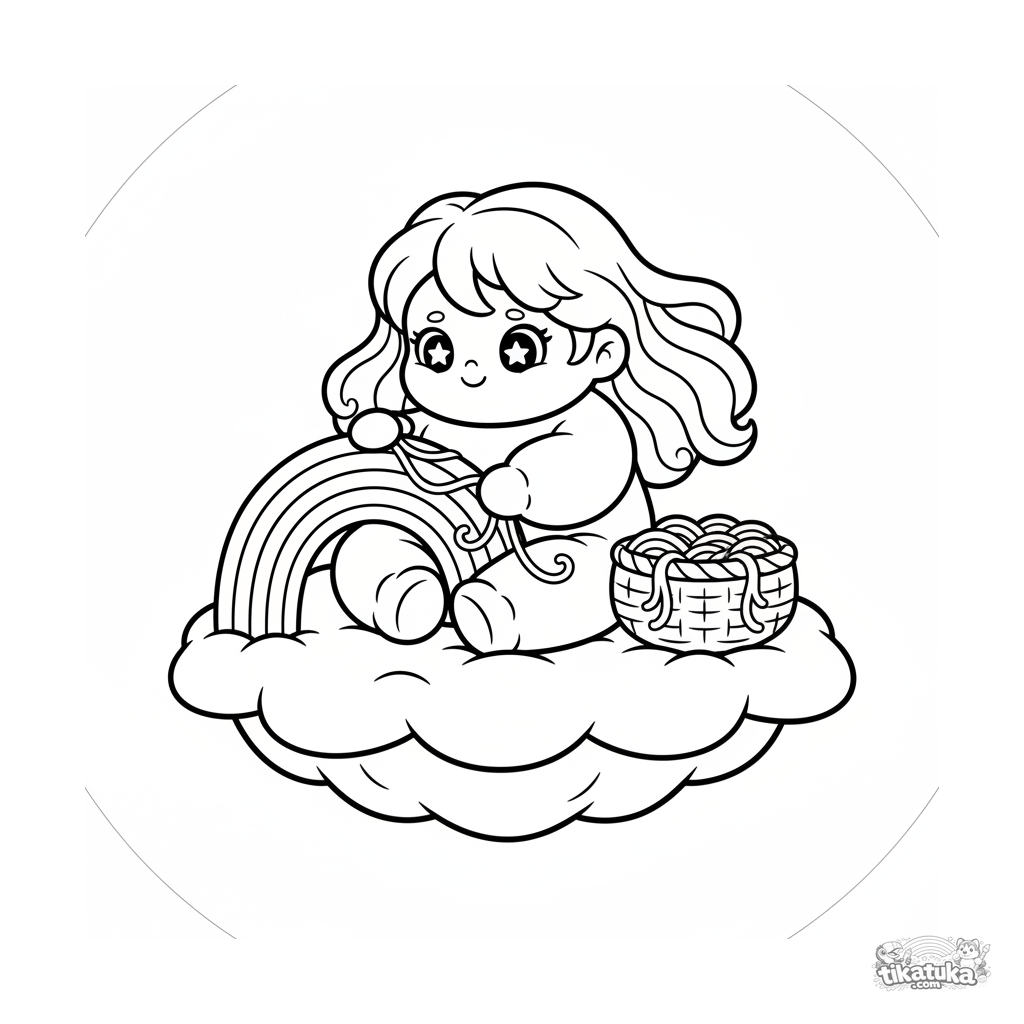 Página simples para colorir para bebês 2-3: um fofo duende das nuvens tecendo um pequeno arco-íris em uma suave ilha flutuante de nuvens.