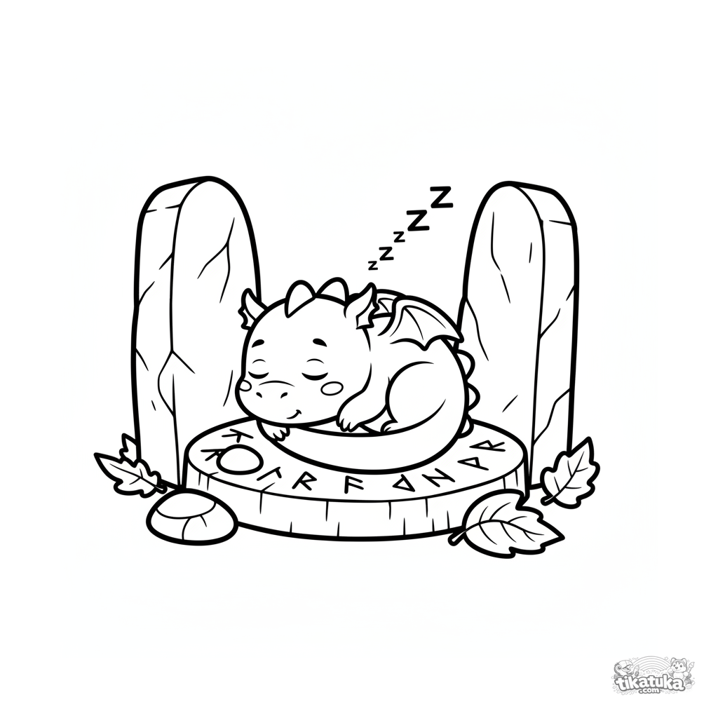 Página para colorir para crianças pequenas de 2-3 anos: um pequeno dragão dorme profundamente, enrolado em uma pedra rúnica. Formas simples e grandes.