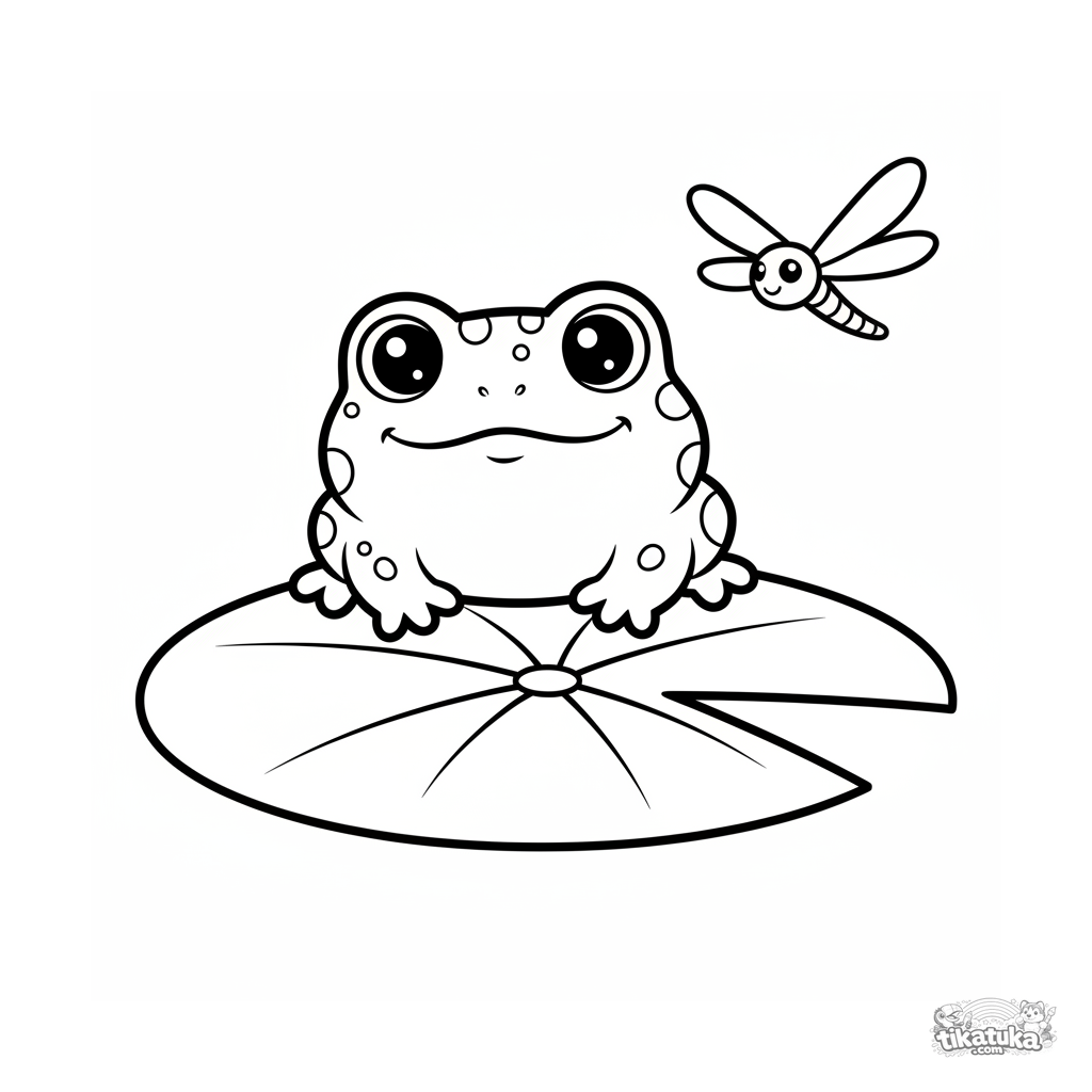 Página para colorir simples para crianças pequenas 2-3: um sapinho fofo senta-se em uma vitória-régia à beira de um riacho, olhando seu reflexo na água.