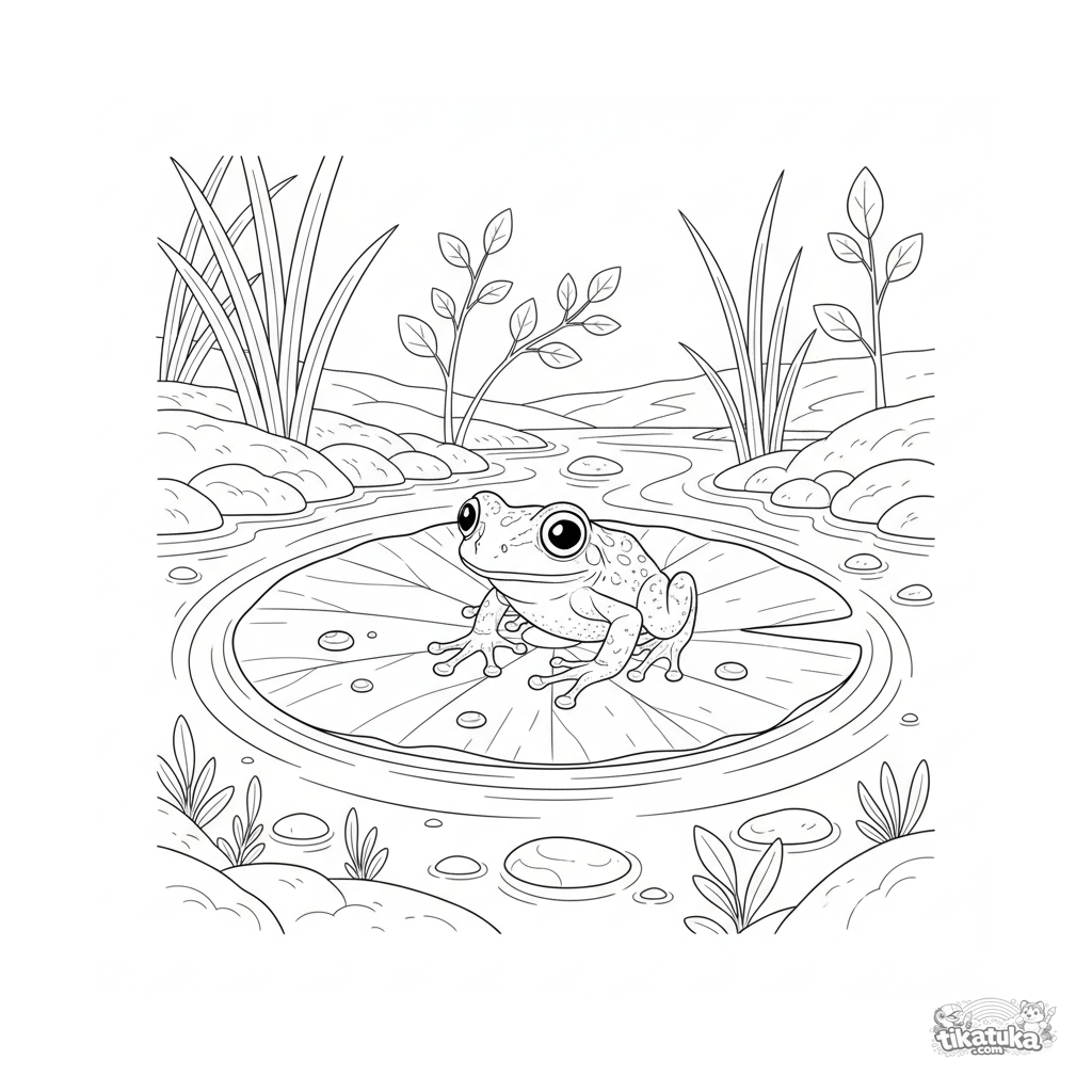 Página para colorir detalhada para 10-12 anos: um pequeno sapo empoleira-se em uma folha de vitória-régia na margem de um riacho claro. Ilustração realista da natureza.
