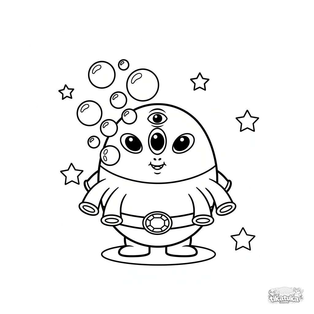 Página para colorir para bebês: um alienígena fofo e gordinho soprando bolhas de sabão entre as estrelas. Formas simples, margens amplas.