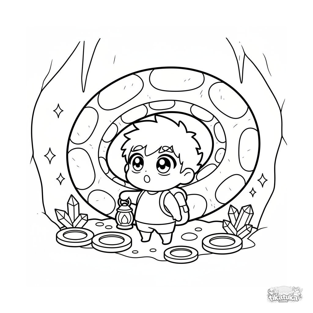 Página simples para colorir para bebês 2-3: um herói chibi fofo com lanterna no covil da Medusa. Formas grandes, poucos detalhes.