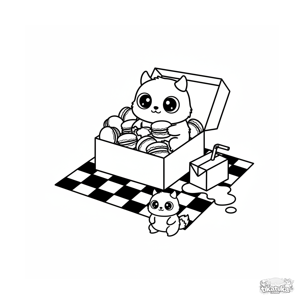 Página para colorir para crianças: um monstrinho com chifres espreita curioso de uma caixa de macarons em um piquenique. Cena fofa e engraçada.
