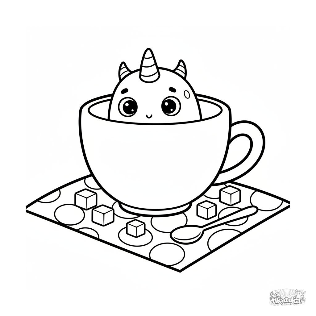 Página muito simples para colorir para bebês de 2 a 3 anos: um monstrinho com chifres espiando de uma xícara grande em um piquenique. Formas grandes e claras.
