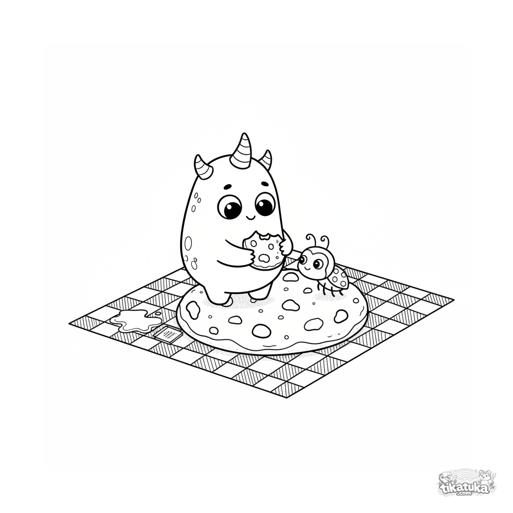 Página para colorir para crianças de 7-9 anos: um monstro pequeno com chifres compartilhando um biscoito com uma joaninha em um piquenique.