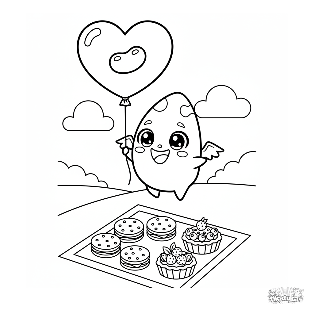 Página para colorir para crianças de 7-9 anos: um monstro minúsculo com asas voa sobre um piquenique segurando um balão em forma de jujuba. Cena dinâmica.