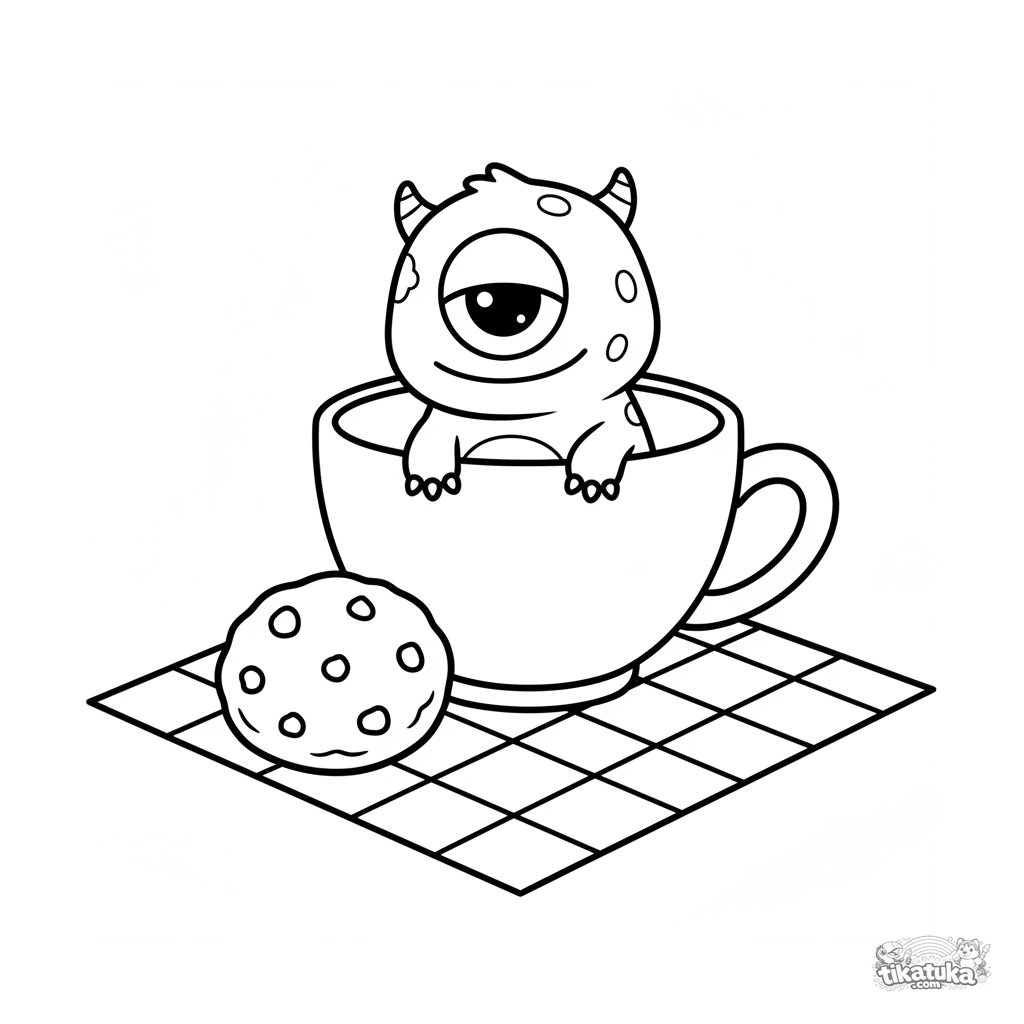 Página muito simples para colorir para crianças pequenas: um monstro minúsculo espiando de uma xícara grande. Formas grandes e claras.