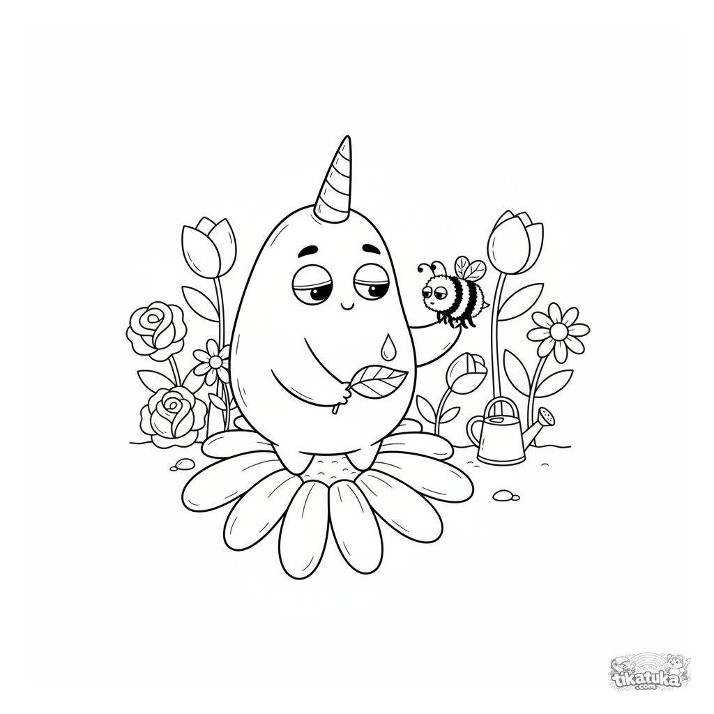 Página para colorir para crianças 4-6: um monstrinho minúsculo com um chifre ajuda um zangão em um jardim de flores. Cena doce sobre amizade e ajuda.