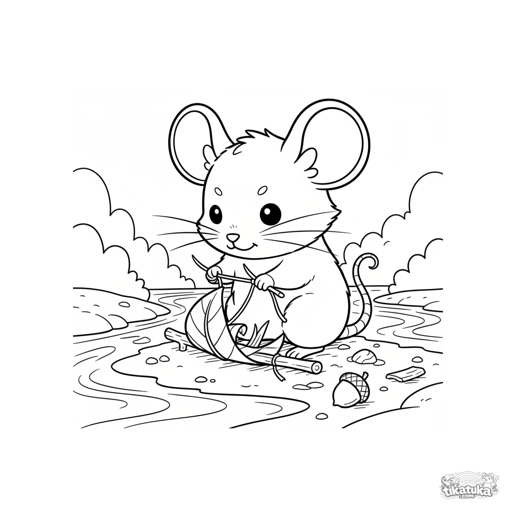 Página para colorir para crianças 7-9 em estilo chibi: um rato minúsculo constrói um barco de folha na margem de um riacho. Cena engraçada e inventiva.