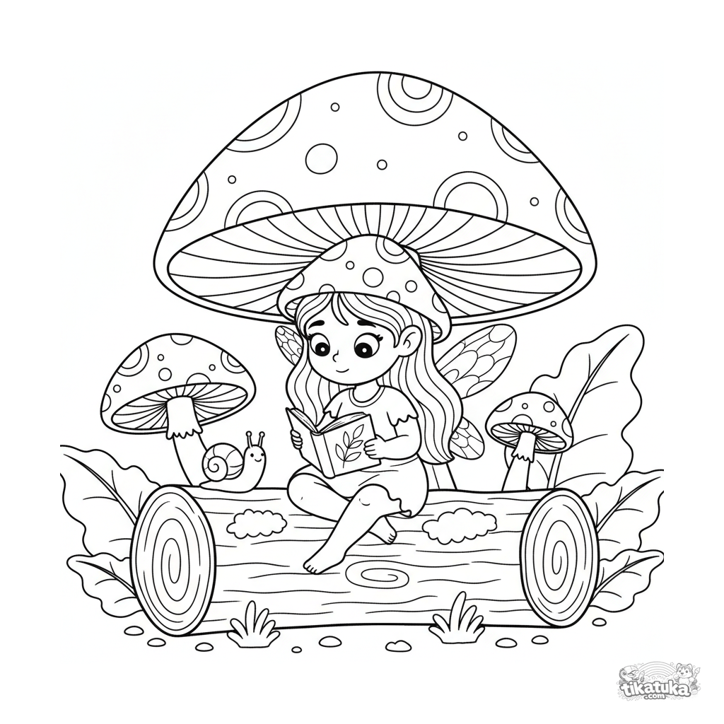 Página para colorir para crianças 4-6: uma fada cogumelo lê um livro sob um cogumelo brilhante em uma floresta encantada. Cena fofa e tranquila.
