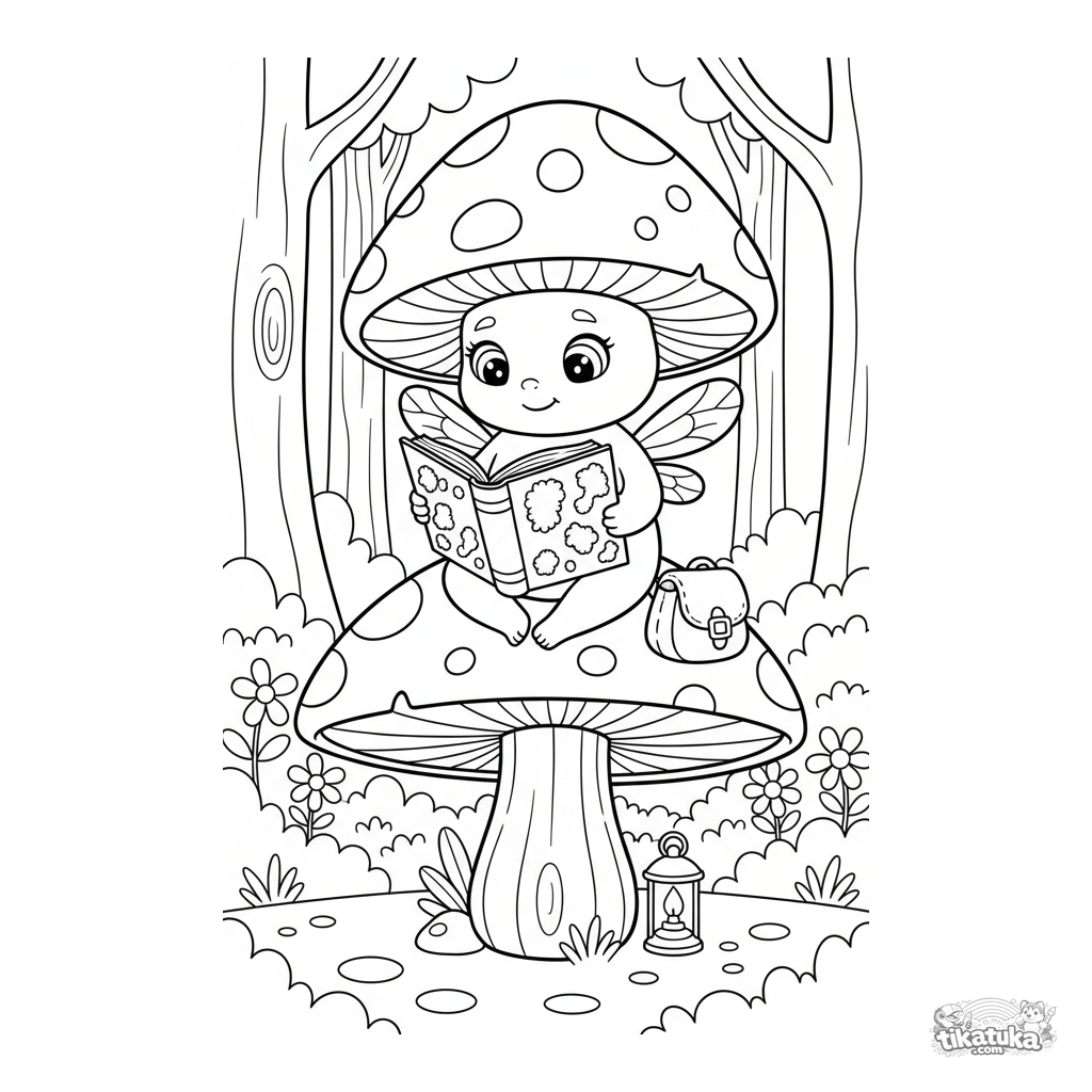 Página para colorir para crianças 4-6: um duende de cogumelo lê um livro de musgo brilhante em uma floresta encantada. Cena de fantasia fofa.