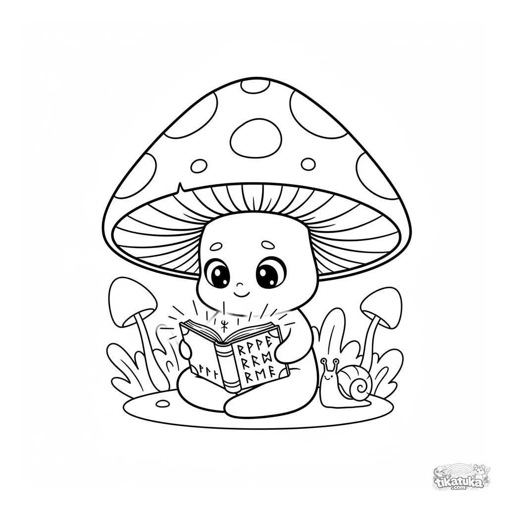 Página para colorir para crianças 4-6: um duende de cogumelo lê um livro mágico sob um cogumelo gigante em uma floresta encantada.