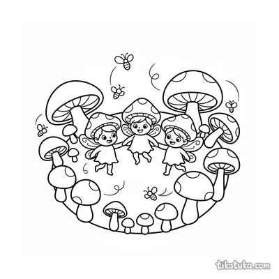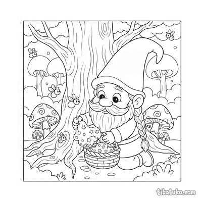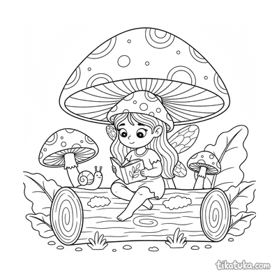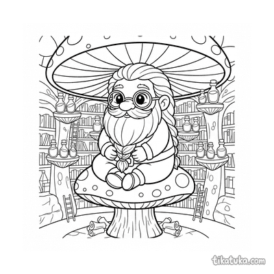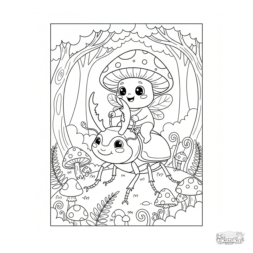 Página para colorir para crianças 4-6: um duende de cogumelo monta um besouro gigante em uma floresta mágica com cogumelos brilhantes.