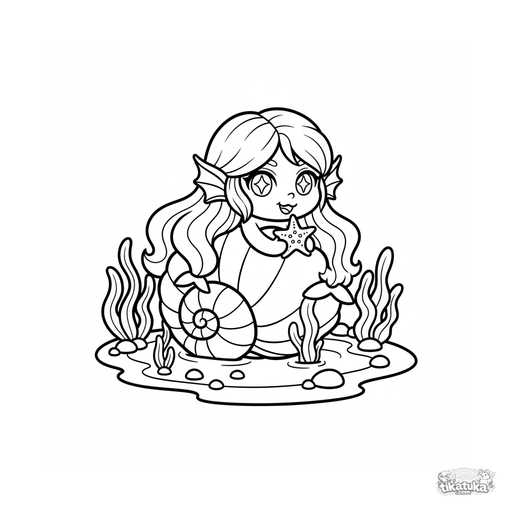 Página simples para colorir para bebês: uma ninfa do mar espreita de uma concha em uma poça de pedra no covil da Górgona. Formas grandes, poucos detalhes.