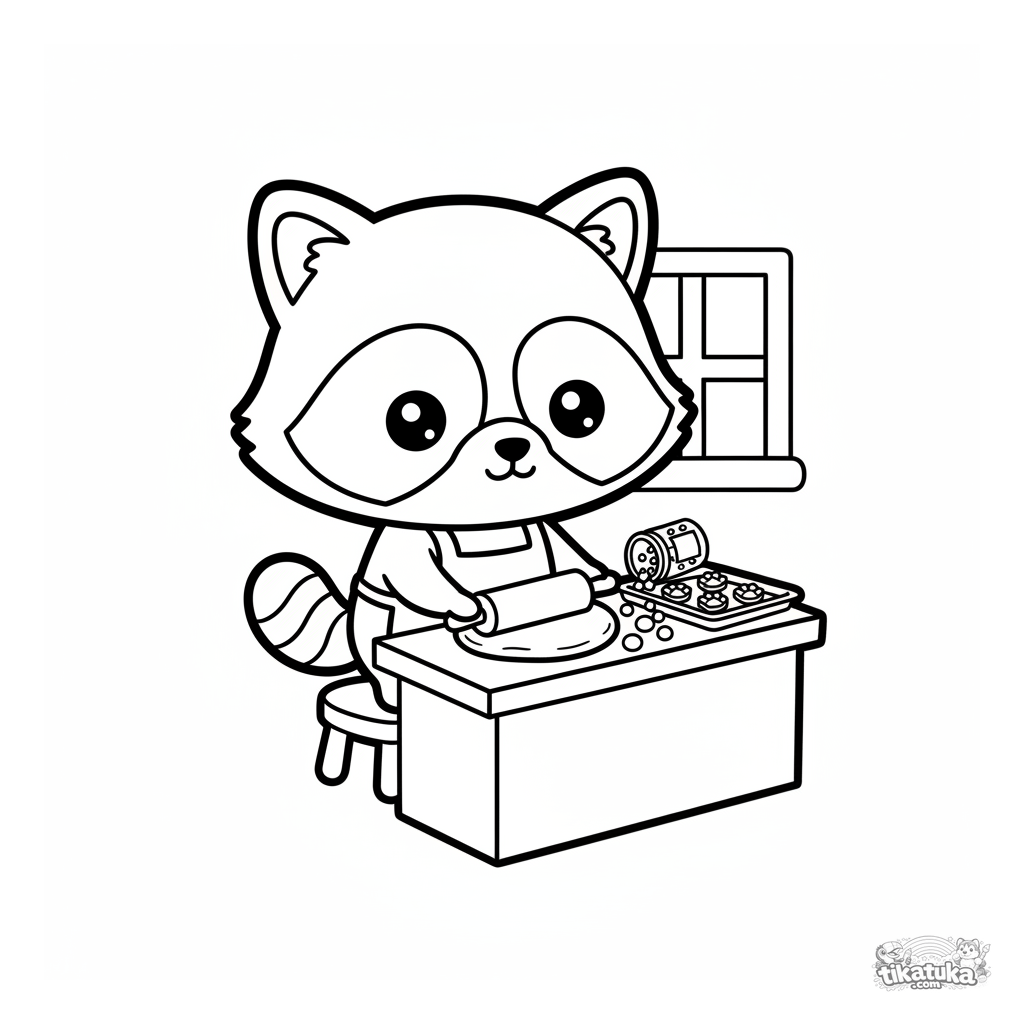 Página para colorir simples para crianças de 2 a 3 anos com um guaxinim fofo assando biscoitos. Formas grandes e margens amplas.