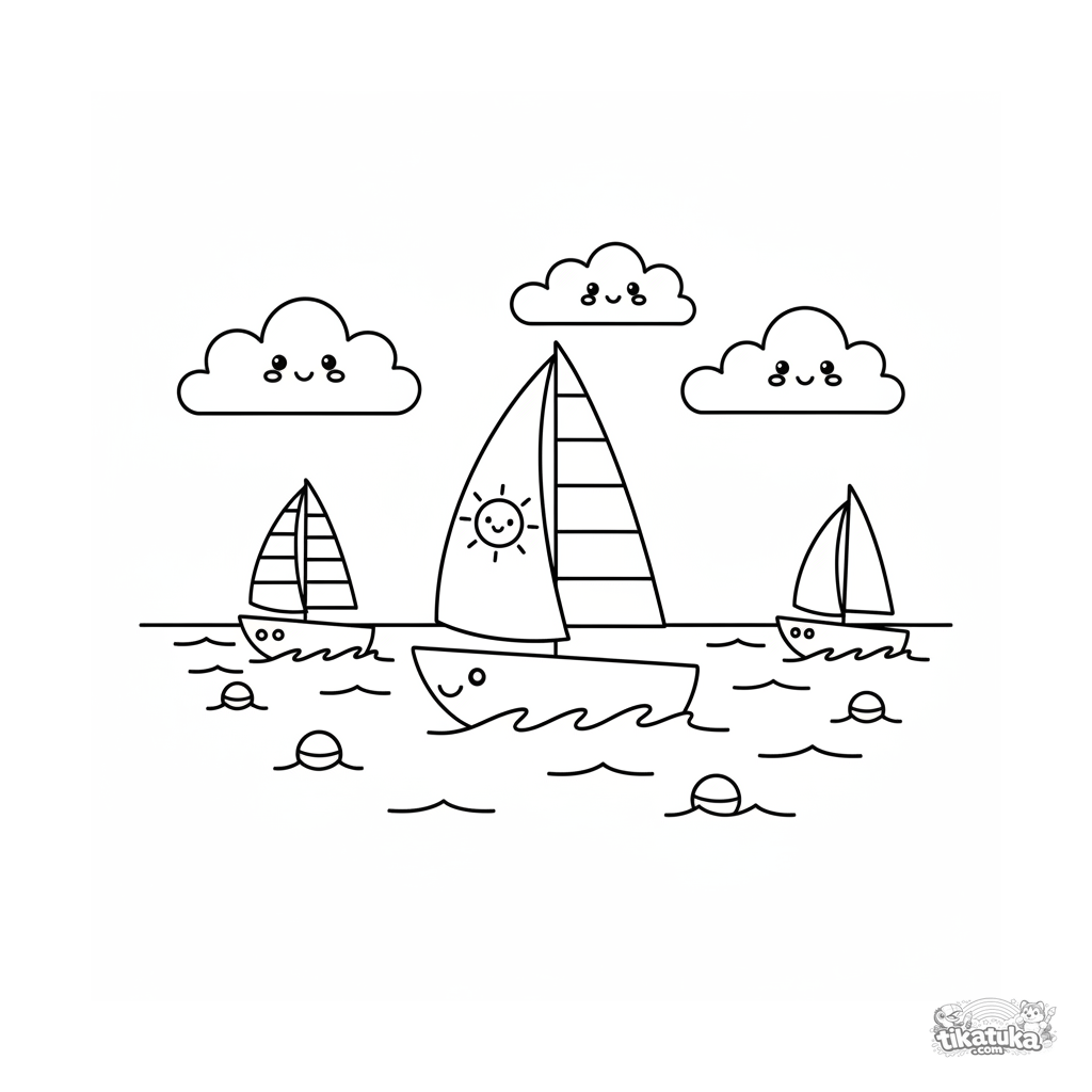 Página para colorir para crianças de 4-6 anos: três pequenos veleiros correm em um lago ensolarado. Formas simples e planas.