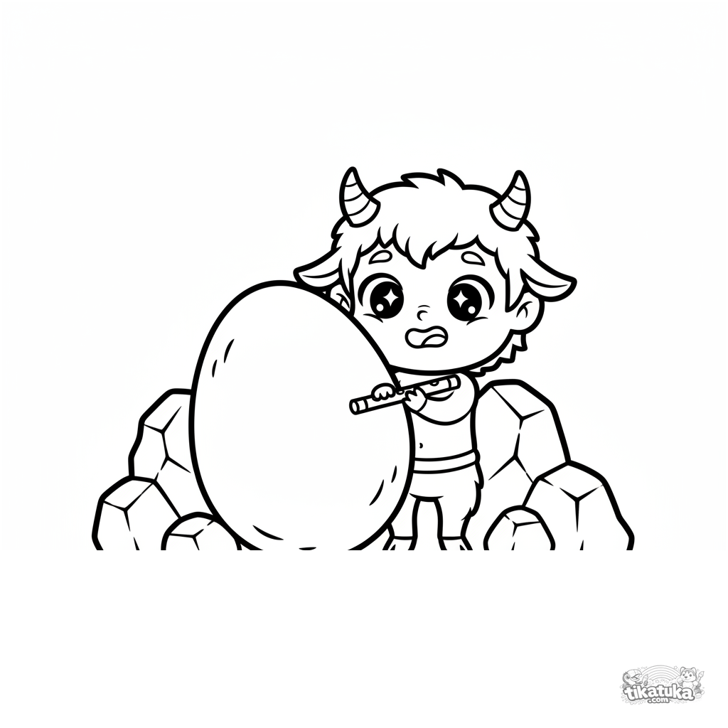 Página para colorir para crianças pequenas 2-3: um pequeno sátiro com chifrinhos e cascos se esconde atrás de um ovo de pedra no covil da Górgona. Formas grandes e simples, expressão facial fofa.
