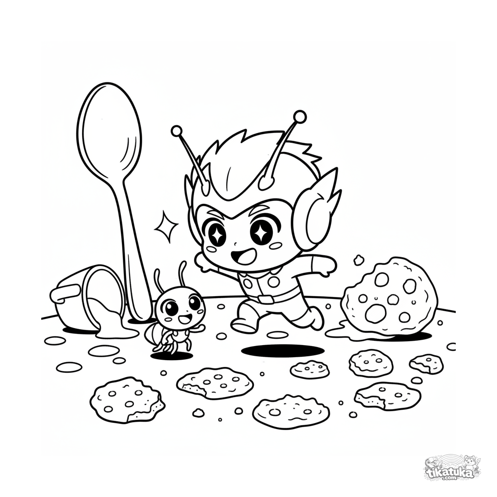 Página para colorir para crianças 4-6: um super-herói miniatura em traje amarelo pula em uma mesa de cozinha gigante com uma formiga companheira. Aventura divertida.