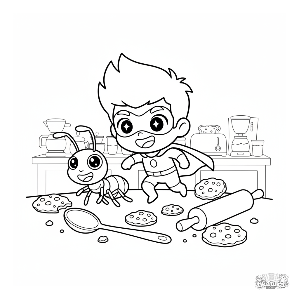 Página para colorir para crianças 4-6: um herói minúsculo em traje amarelo pula sobre uma mesa de cozinha gigante com uma formiga parceira.