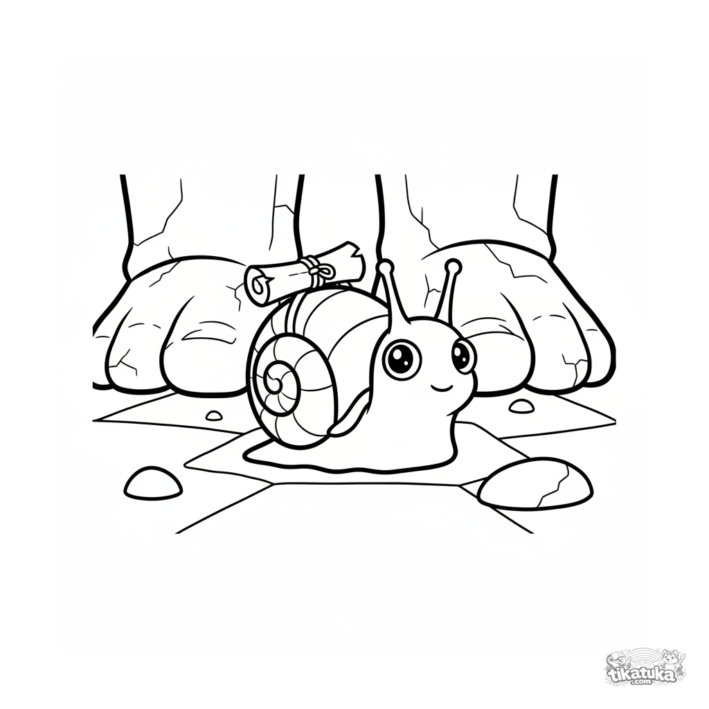 Página para colorir simples para crianças pequenas de 2-3 anos: um caracol fofo com uma mensagem rasteja pelo chão da caverna da Górgona.