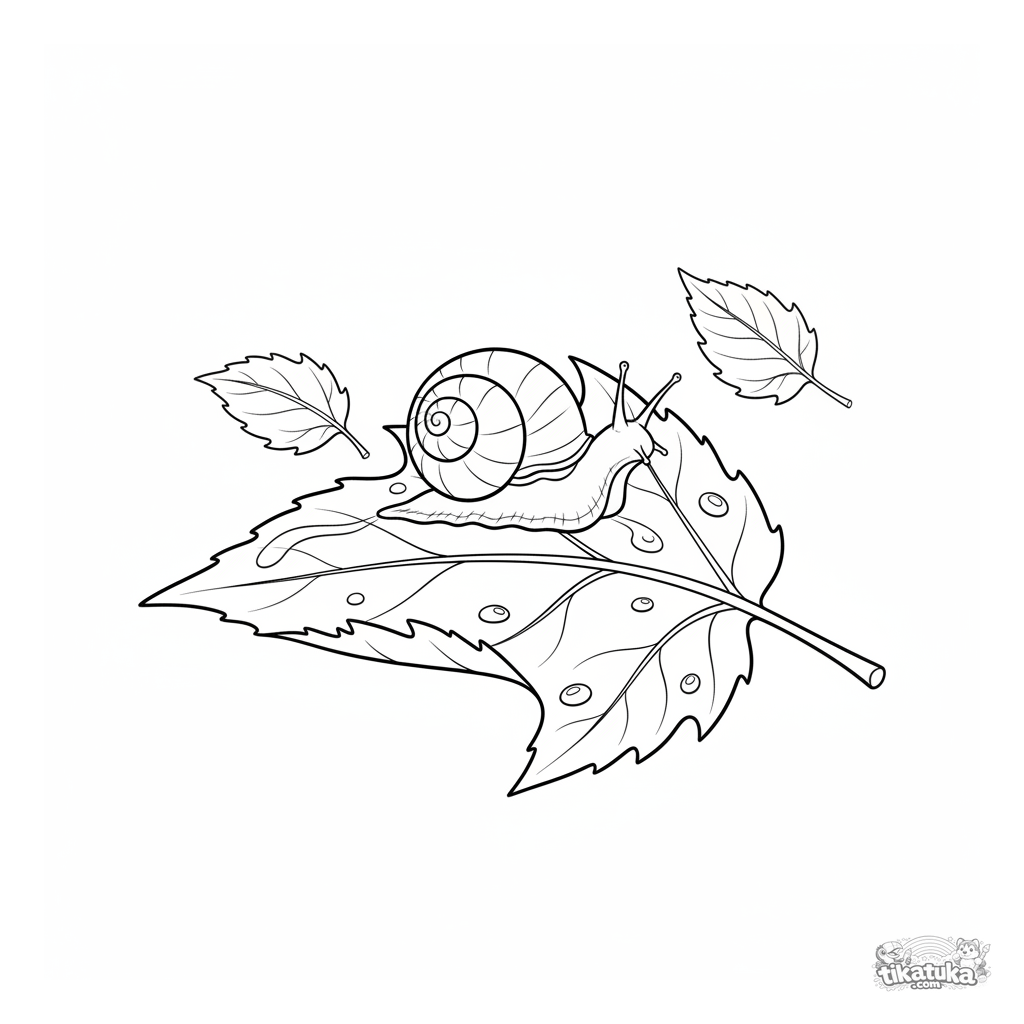 Página para colorir para crianças 4-6: um caracol pequeno rasteja em uma folha de bordo molhada após a chuva. Detalhes da concha, gotas de água, cena da natureza.