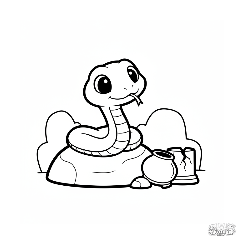 Página simples para colorir para crianças pequenas de 2-3 anos: cobrinha fofa do cabelo da Medusa em um covil de pedra. Formas grandes e claras.