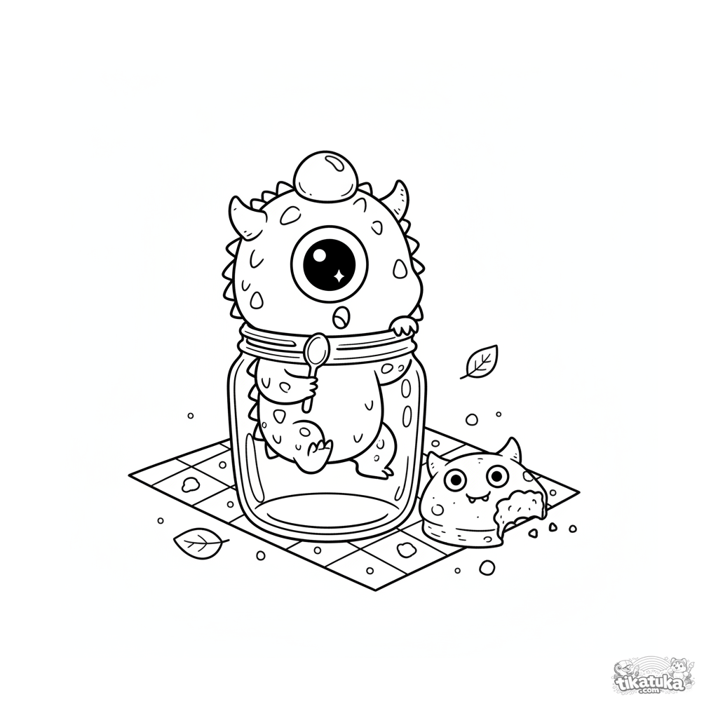 Página para colorir para crianças de 4-6 anos: um monstrinho espinhoso escondido em um pote de geleia em um piquenique. Cena engraçada.