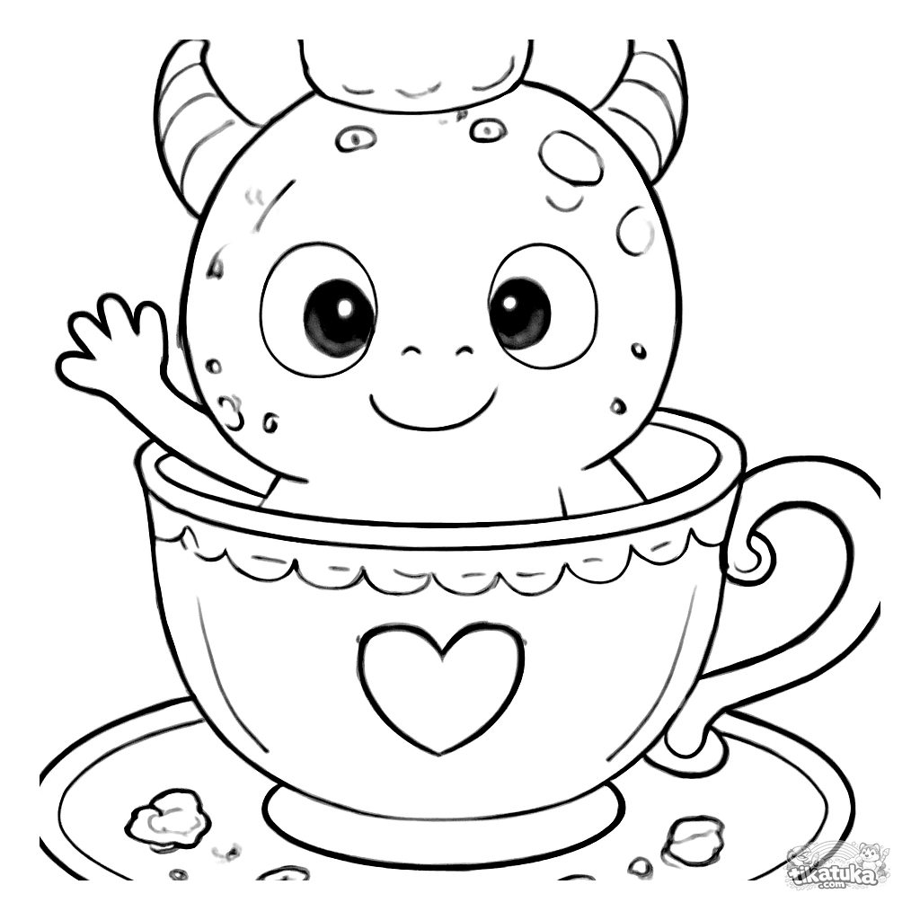Página para colorir de um monstro manchado minúsculo em uma xícara de chá. Para crianças de 2 a 5 anos. O monstro fofo com coroa de papel acena com a pata, migalhas de biscoito ao redor.
