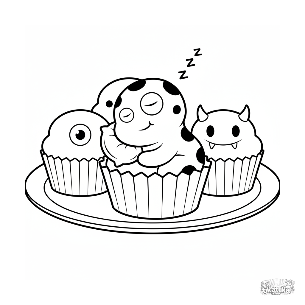 Página simples para colorir para crianças 2-3: um monstrinho pintado dormindo em uma forma de cupcake em um piquenique. Formas grandes, poucos detalhes.