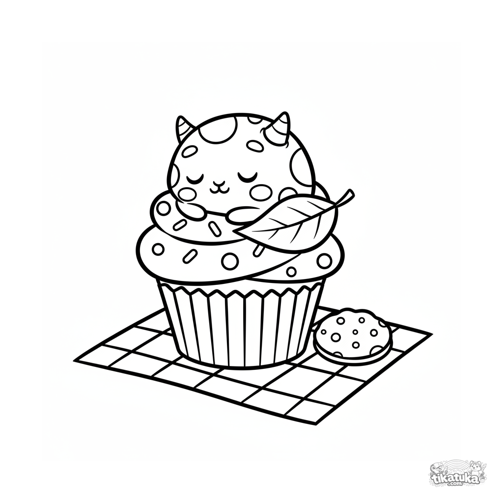 Página simples para colorir para crianças de 2-3 anos: um monstrinho dormindo em um cupcake gigante em um piquenique. Formas grandes, contornos claros.