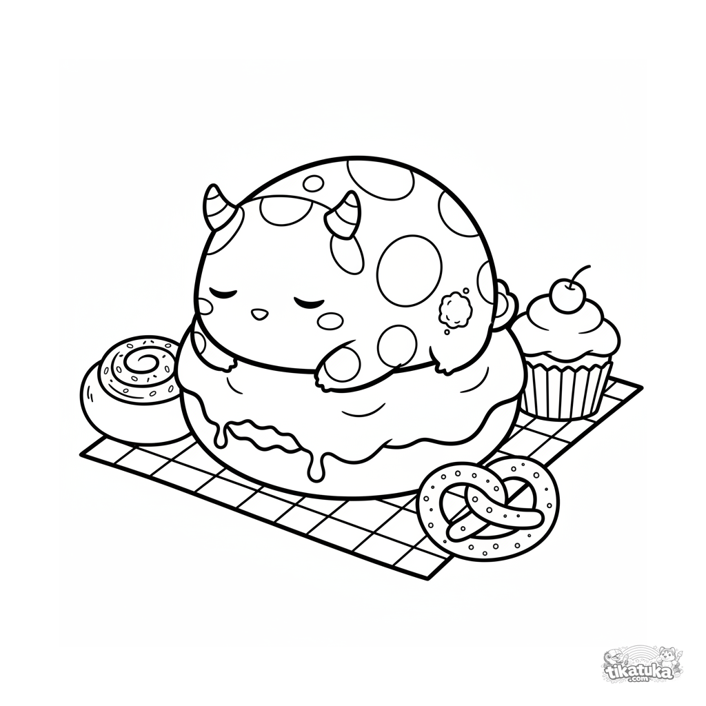 Página simples para colorir para crianças pequenas: um monstro minúsculo pintado dormindo em um donut grande de geleia em um piquenique. Formas grandes, poucos detalhes, para crianças de 2-3 anos.
