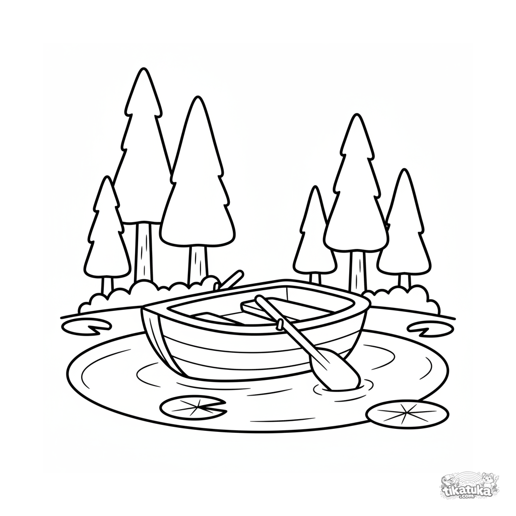 Página para colorir para bebês: um pequeno barco a remos em um lago florestal calmo e nebuloso. Formas simples e margens amplas.