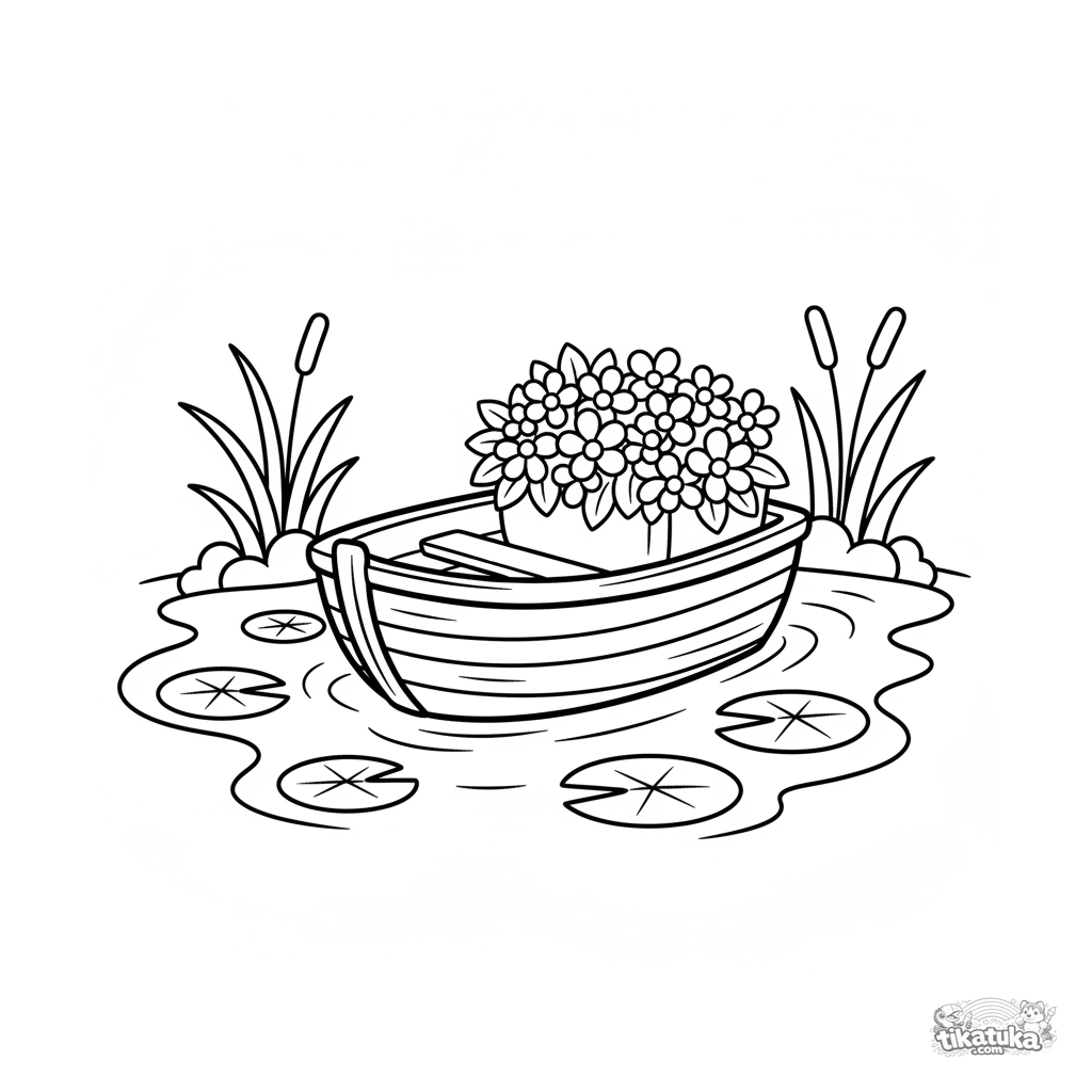 Página para colorir para crianças pequenas: um pequeno barco a remos com uma caixa de flores flutua em um lago calmo.