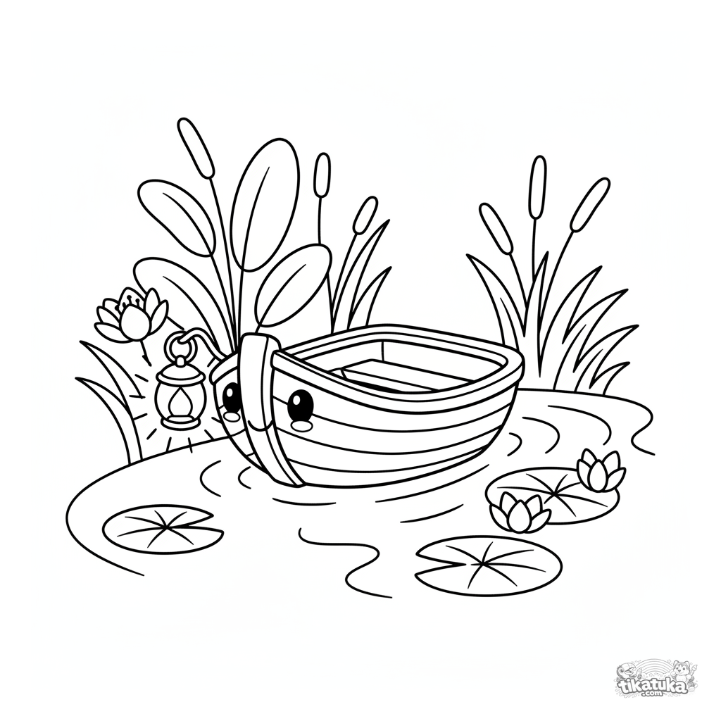 Página para colorir para bebês: um barquinho de madeira com lanterna flutua em um rio enevoado ao amanhecer. Formas simples, margens amplas.