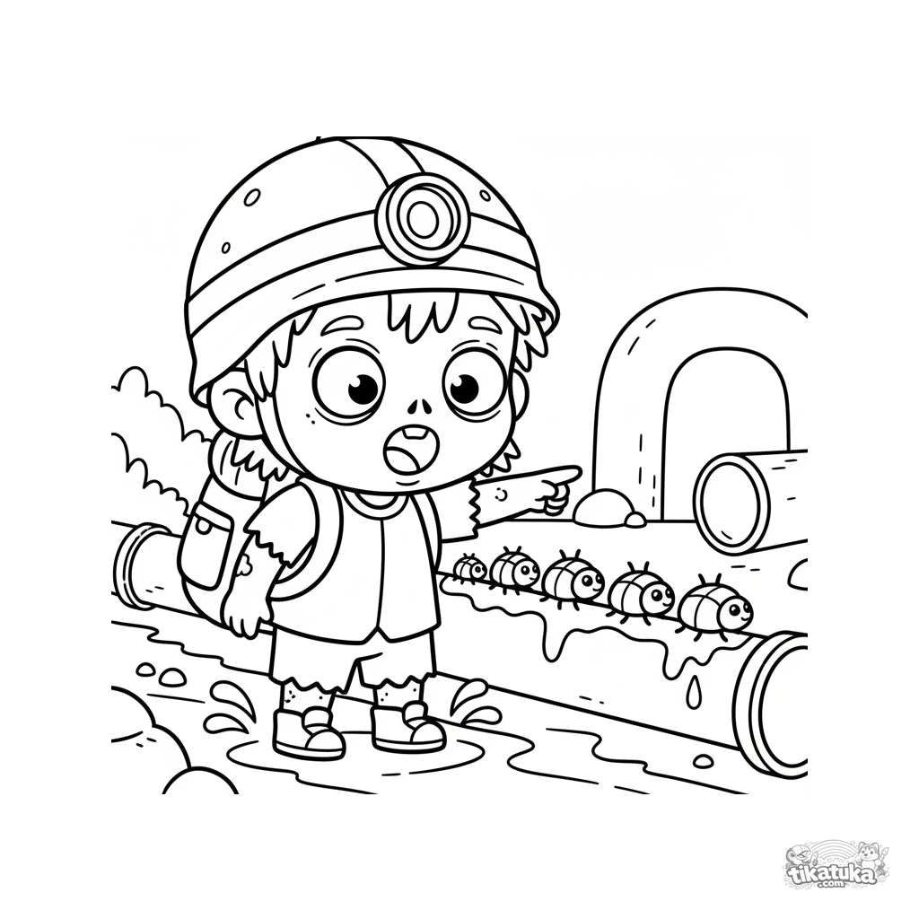 Página simples para colorir para crianças pequenas de 2-3 anos: um pequeno zumbi explorador com mochila em um túnel de esgoto. Formas grandes, poucos detalhes.