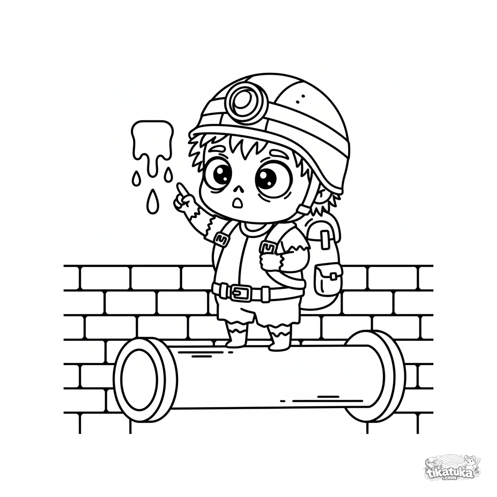Página simples para colorir para crianças pequenas de 2-3 anos: um pequeno zumbi explorador em um túnel de esgoto. Formas grandes, detalhes mínimos.