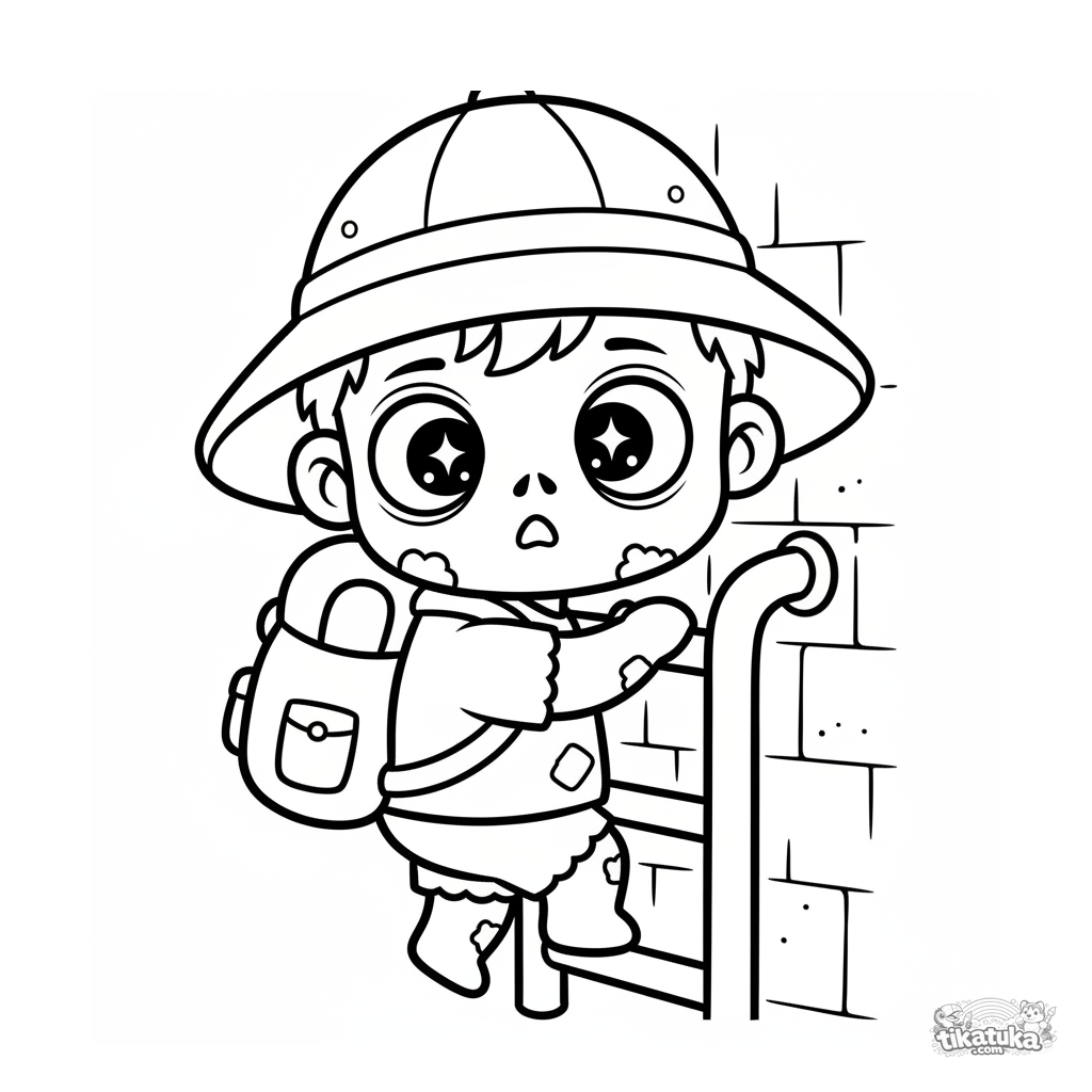 Página para colorir para crianças pequenas 2-3: um pequeno zumbi explorador descendo uma escada para um esgoto. Formas simples e grandes.