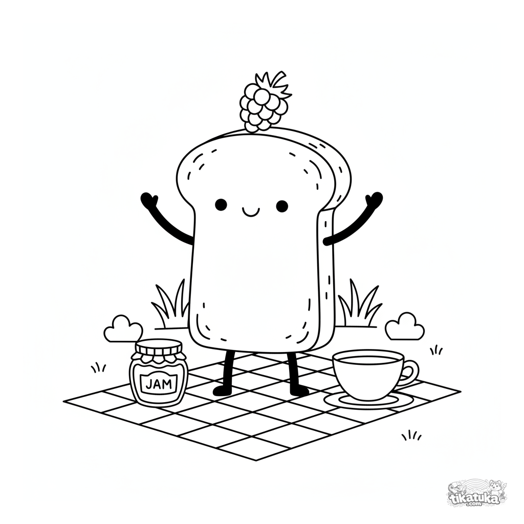 Página para colorir para crianças: uma fatia de torrada com rosto equilibra uma frutinha na cabeça em um piquenique. Cena divertida para crianças de 4 a 6 anos, desenvolve habilidades motoras.