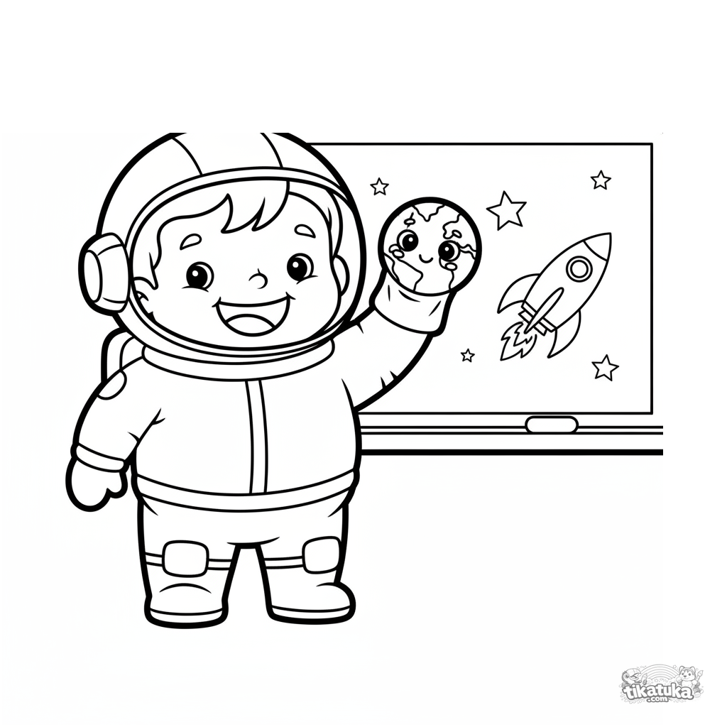 Página para colorir simples para bebês 2-3: um astronauta faz um show de fantoches no quadro da sala de aula. Formas grandes e claras, margens amplas, personagem amigável.