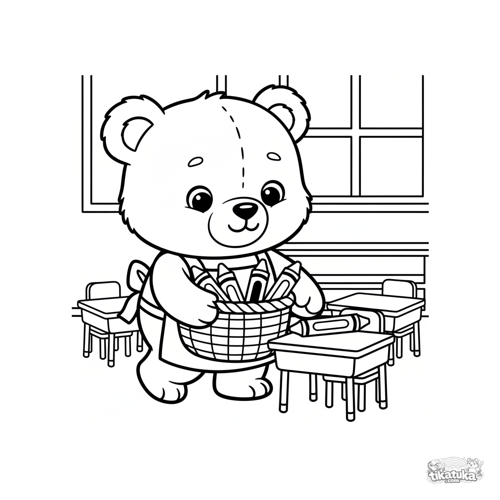 Página para colorir para crianças pequenas 2-3: um filhote de urso de pelúcia auxiliar distribui giz de cera em uma sala de aula. Formas simples enormes, margens muito amplas.
