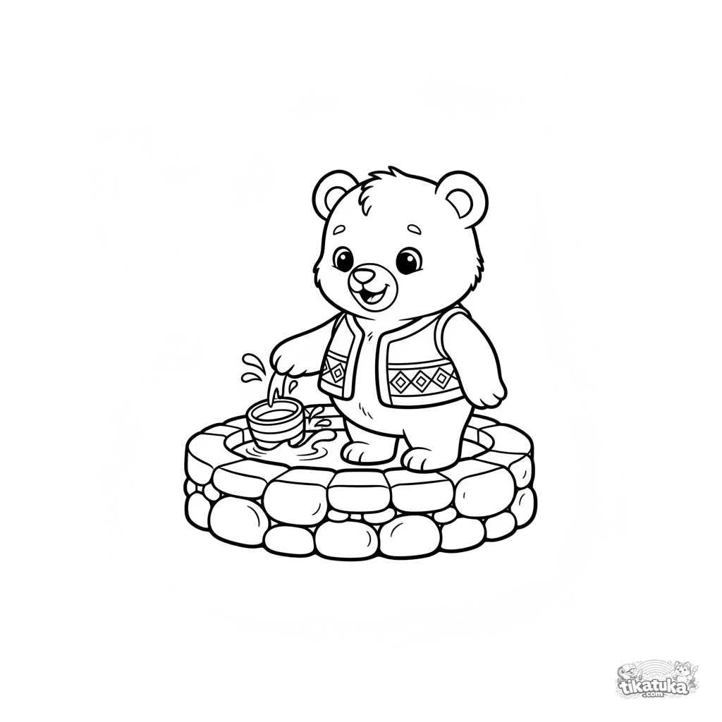 Página simples para colorir para crianças pequenas 2-3: um filhote de urso fofo com colete brinca junto ao poço de água viva. Formas grandes, contornos grossos, poucos detalhes.