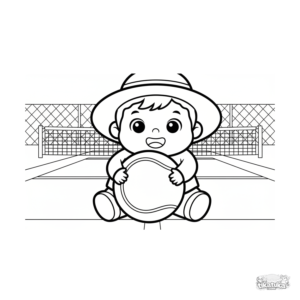 Página para colorir para crianças de 2-3 anos: uma criança feliz abraçando uma bola de tênis gigante. Formas simples enormes e detalhes mínimos.