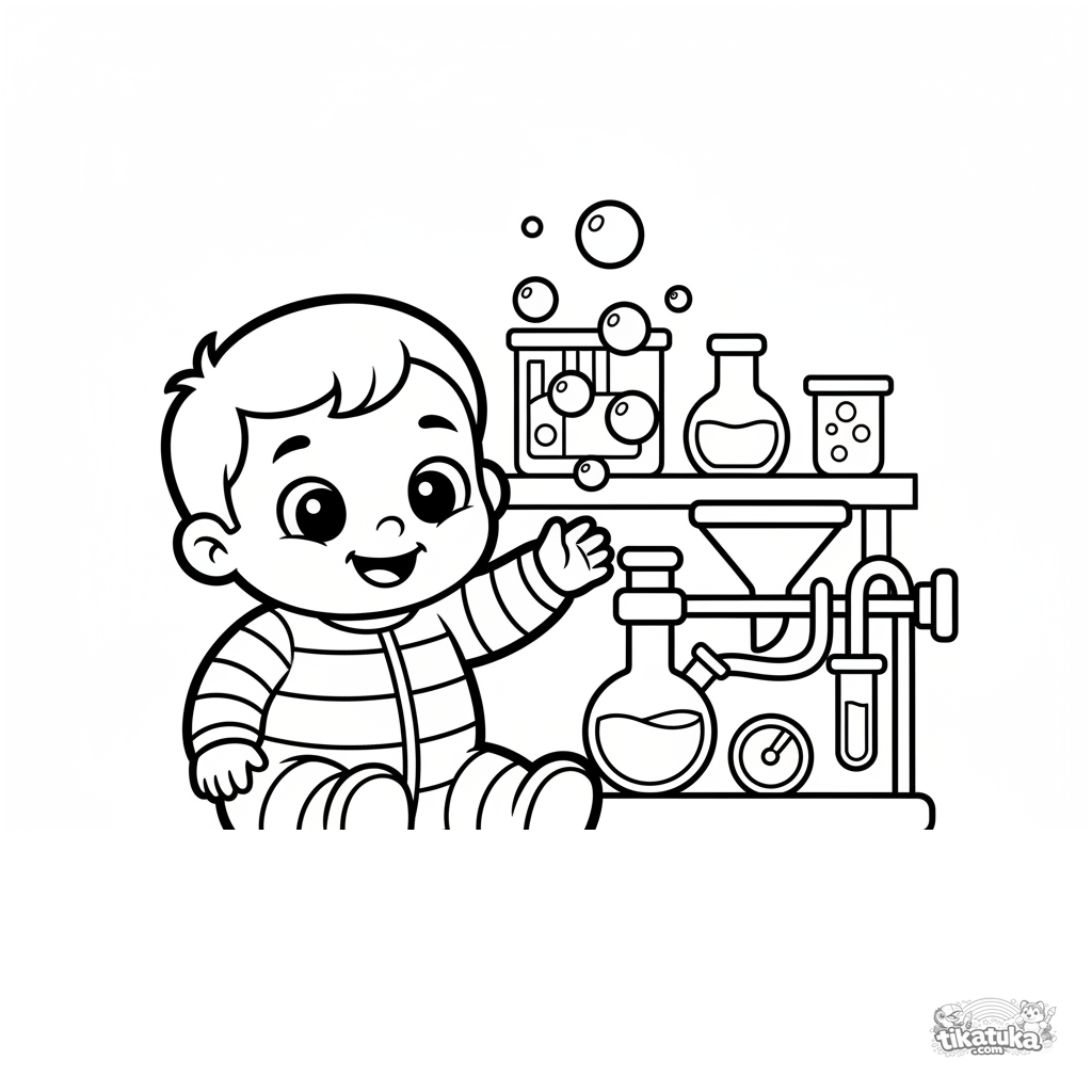 Página para colorir simples para crianças de 2-3 anos: um menino em um laboratório encantado com bolhas de uma máquina grande e amigável.